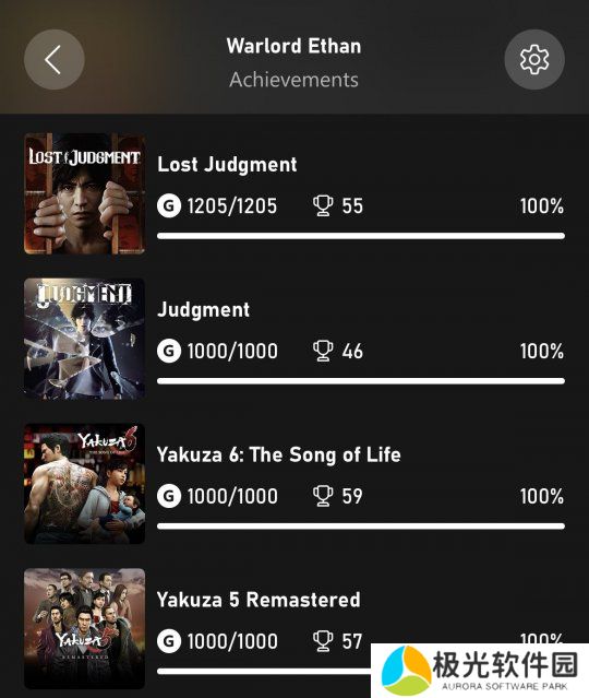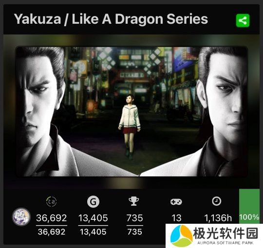 该玩家在推特上晒出了他的XboxGamerscore统计截图,其中可以看到包含《审判之眼》和《如龙:维新!极》在内的共计13款“如龙”系列游戏,都达成了100%全成就通关。