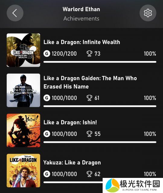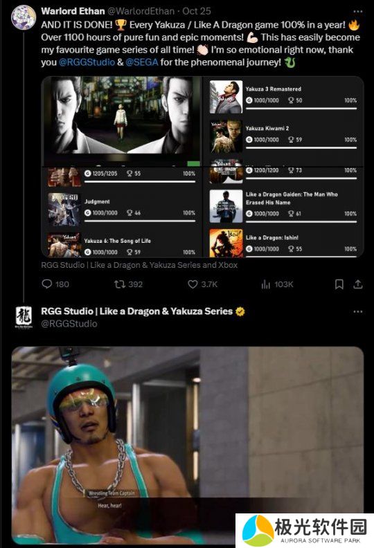 不过《如龙》系列的粉丝玩家可能更关注的还是游戏作品,例如最近完成了1年内全部100%通关系列游戏成就的玩家“Warlord Ethan”。