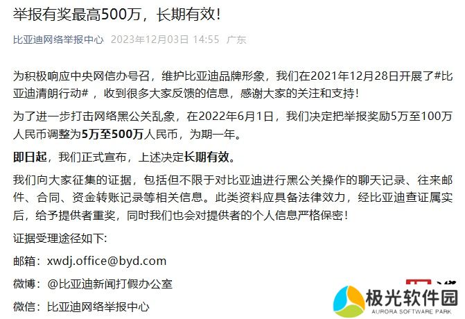 据此前报道,比亚迪品牌公关处总经理李云飞在去年 12 月发布声明,先是批判了一些“汽车行业乱象”,然后宣布用 5-500 万元的奖金来进行悬赏,希望知情者能够提供线索及资料。比亚迪网络举报中心也发布了最高 500 万的举报有奖公告。
