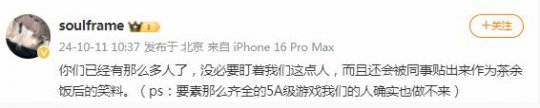 对此,梁其伟在微博发文进行了吐槽。他表示:“你们已经有那么多人了,没必要盯着我们这点人,而且还会被同事贴出来作为茶余饭后的笑料。”而从PS内容中所提到的“5A级游戏”的标准,以及对方公司的规模来看,对方很可能是国内的知名大厂。