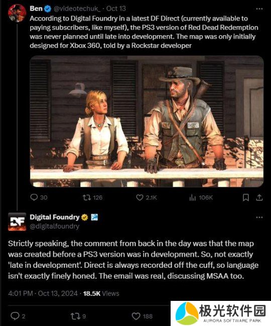 在观看过视频后,推特用户“Ben”透露在视频中数毛社表示,直到《荒野大镖客:救赎》的开发后期,PS3版本才被列入计划中。而Rockstar的一位员工透露,游戏最初的地图,都是为Xbox 360主机设计的。