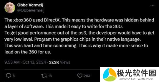 随后R星前技术总监Obbe Vermeij(他在2009年离开工作室)也在推文底下回复,表示由于“xbox360使用了DirectX,这意味着硬件隐藏在软件层后面,进而使得为360编写代码变得容易。而要让PS3发挥出良好的性能,开发人员必须深入到非常低的层级,用图形芯片的编程语言对其进行编程。这很困难,而且很耗时。这就是为什么对(当时的)我们来说,优先开发360版更有意义。”