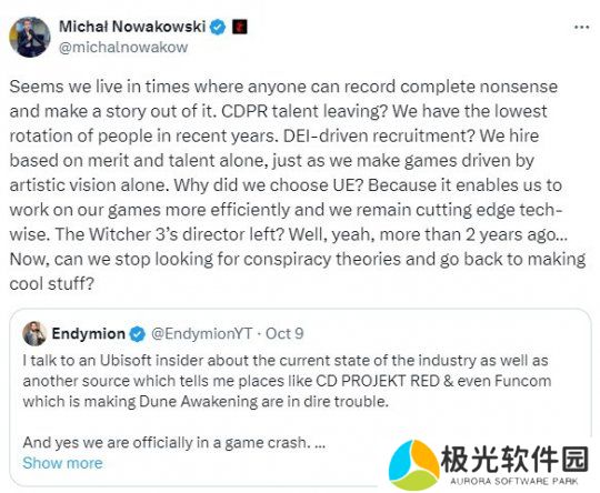 之前有传言称CDPR已陷入困境,因为关注DEI和失去高级人才。最近CDPR对该传言予以否认,CDPR联合首席执行官Michal Nowakowski发推文称这是无稽之谈,请停止阴谋论。