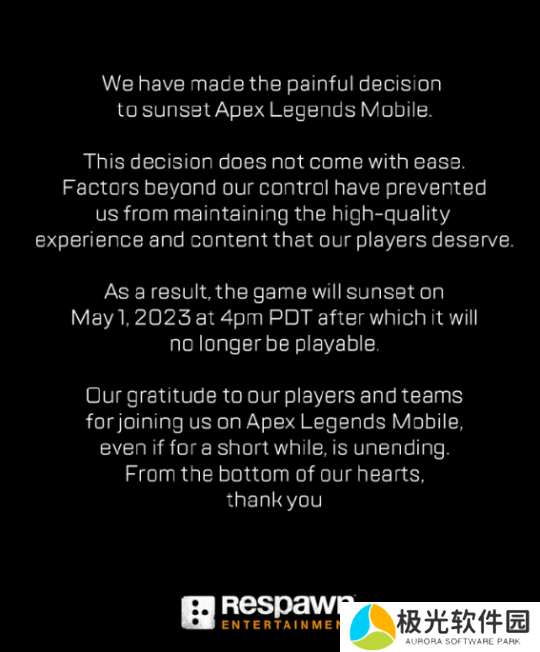 《APEX英雄》手游在2022年5月17日正式发售,但却在2023年5月1日正式停服,中间运营了不足一年。官方表示: