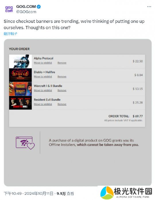 此次,Steam在用户协议中明确指出“玩家只有游戏的体验权”这点后,另一个游戏平台GOG乘势进行了补充发言,为自家平台打起了广告。因为在GOG购买的游戏,都能够进行离线安装。玩家购买后,真的能够永久使用下去。