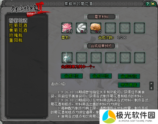 大侠参与游戏副本及塞北金戈系统,还可以额外获得制作菊花酒和重阳糕的材料,在“游戏活动大使”处领取食谱就可以烹饪民俗美食啦。