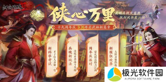 西山居经典剑侠情缘系列游戏--《剑网2》十九周年庆资料片“侠心万里”9.26正式发布!周年庆资料片带来新科举考试、兵魄洗炼玩法、周年庆回馈活动等丰富内容,十九周年新服“苍龙逐日”也在当日15:00火爆开启,十大福利活动助飞江湖。截止到发稿,周年庆福利仍在放送中,欢迎新老玩家体验,开启武林新篇章!