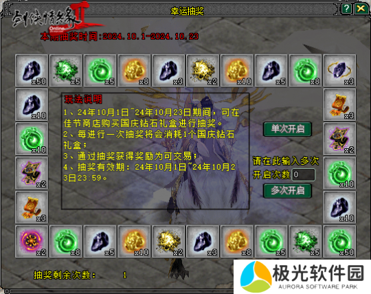 10月1日-10月23日期间,大侠右键使用【国庆欢乐礼盒】、【国庆钻石礼盒】可以进行幸运抽奖,快来试试手气如何。