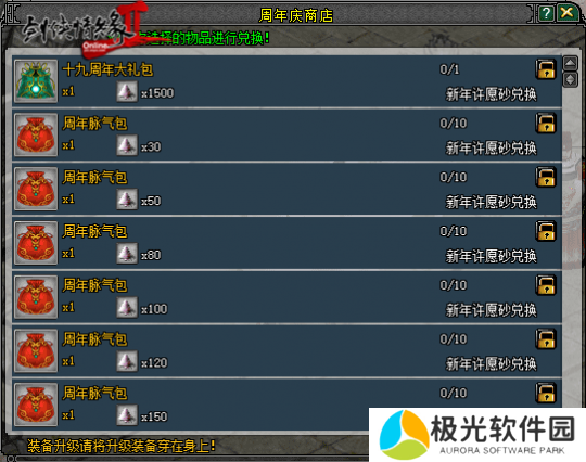 10月23日前,大侠都可以前往“周年庆使者”处购买【十九周年大礼包】、【周年脉气包】等好礼,周年称号“侠心万里十九载”限时售卖!