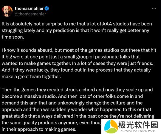 托马斯·马勒表示,AAA工作室目前的困境并不令人意外。他解释说,游戏的发展源于才华横溢的开发者的热情和兴趣,他们希望为粉丝提供真正令人愉悦的体验。