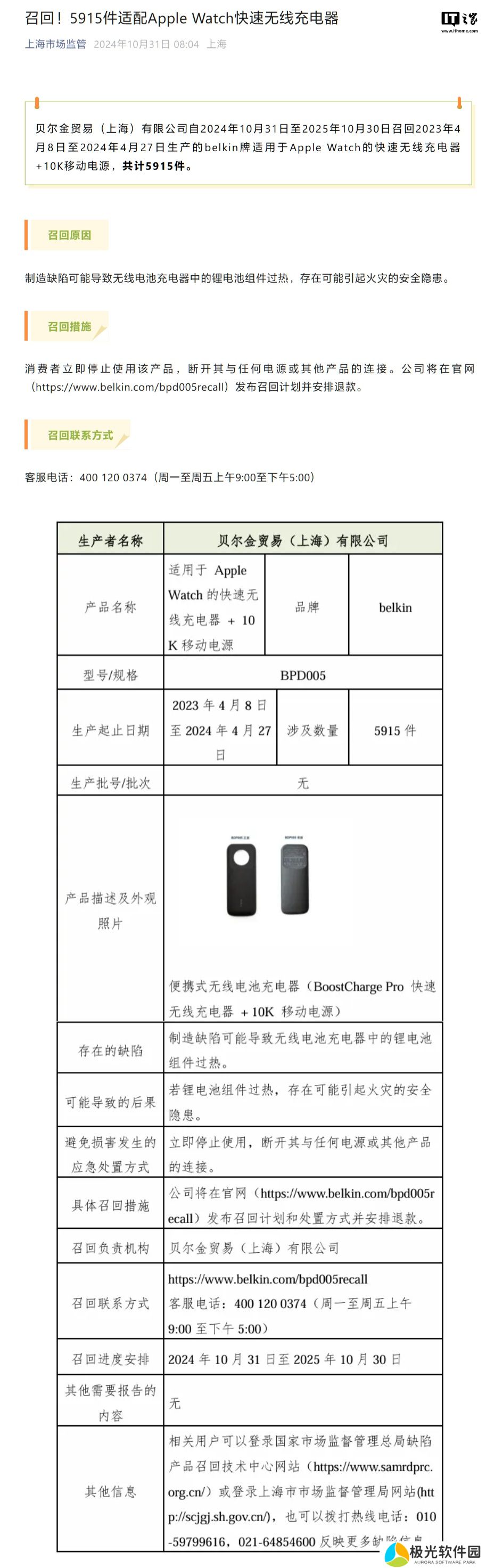 上海市场监管局:贝尔金召回 5915 件适配苹果 Apple Watch 快速无线充电器